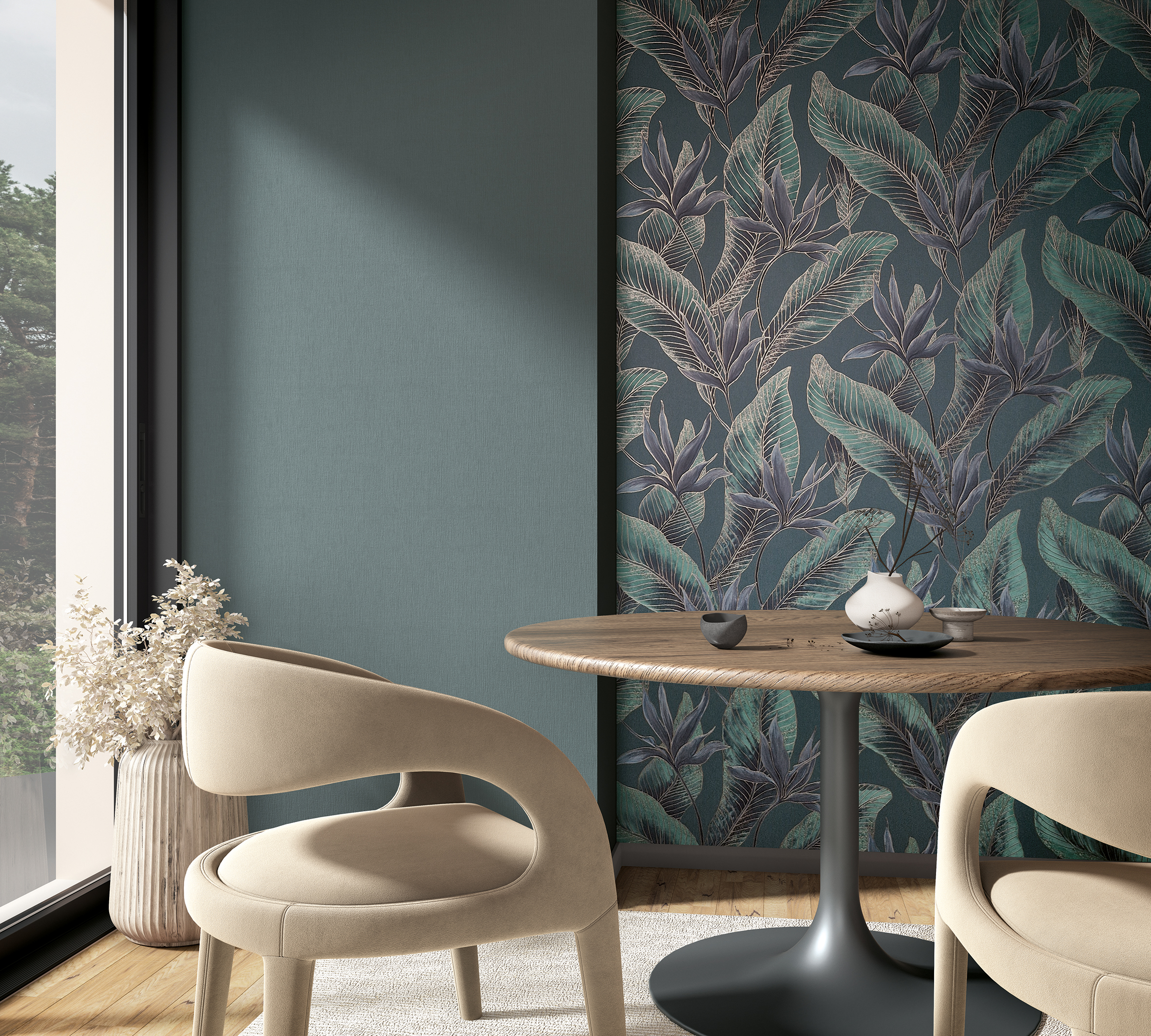 В основе коллекции — растительные мотивы, словно выполненные из тончайшей ткани или вышитые светом. Листва выглядит воздушной и объемной, но при этом остается сдержанной и благородной. Рисунок не доминирует, а словно растворяется в пространстве, создавая ощущение уюта и визуального покоя.
