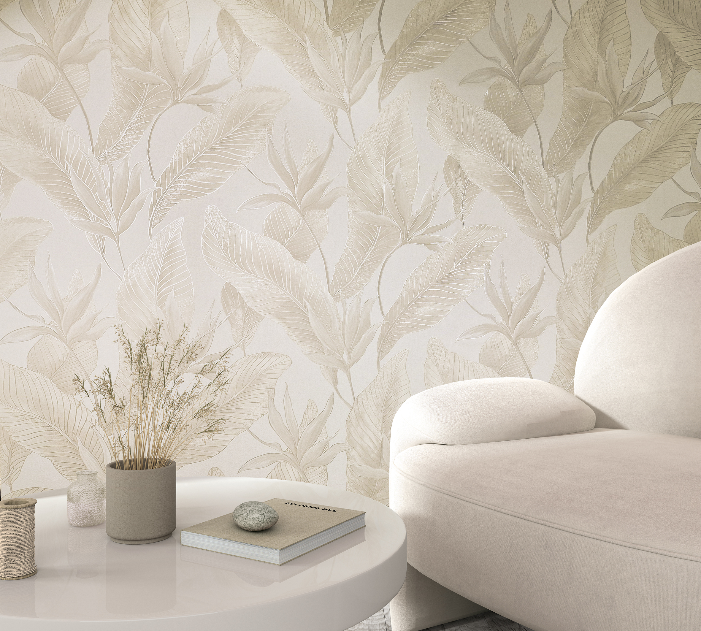 В основе коллекции — растительные мотивы, словно выполненные из тончайшей ткани или вышитые светом. Листва выглядит воздушной и объемной, но при этом остается сдержанной и благородной. Рисунок не доминирует, а словно растворяется в пространстве, создавая ощущение уюта и визуального покоя.