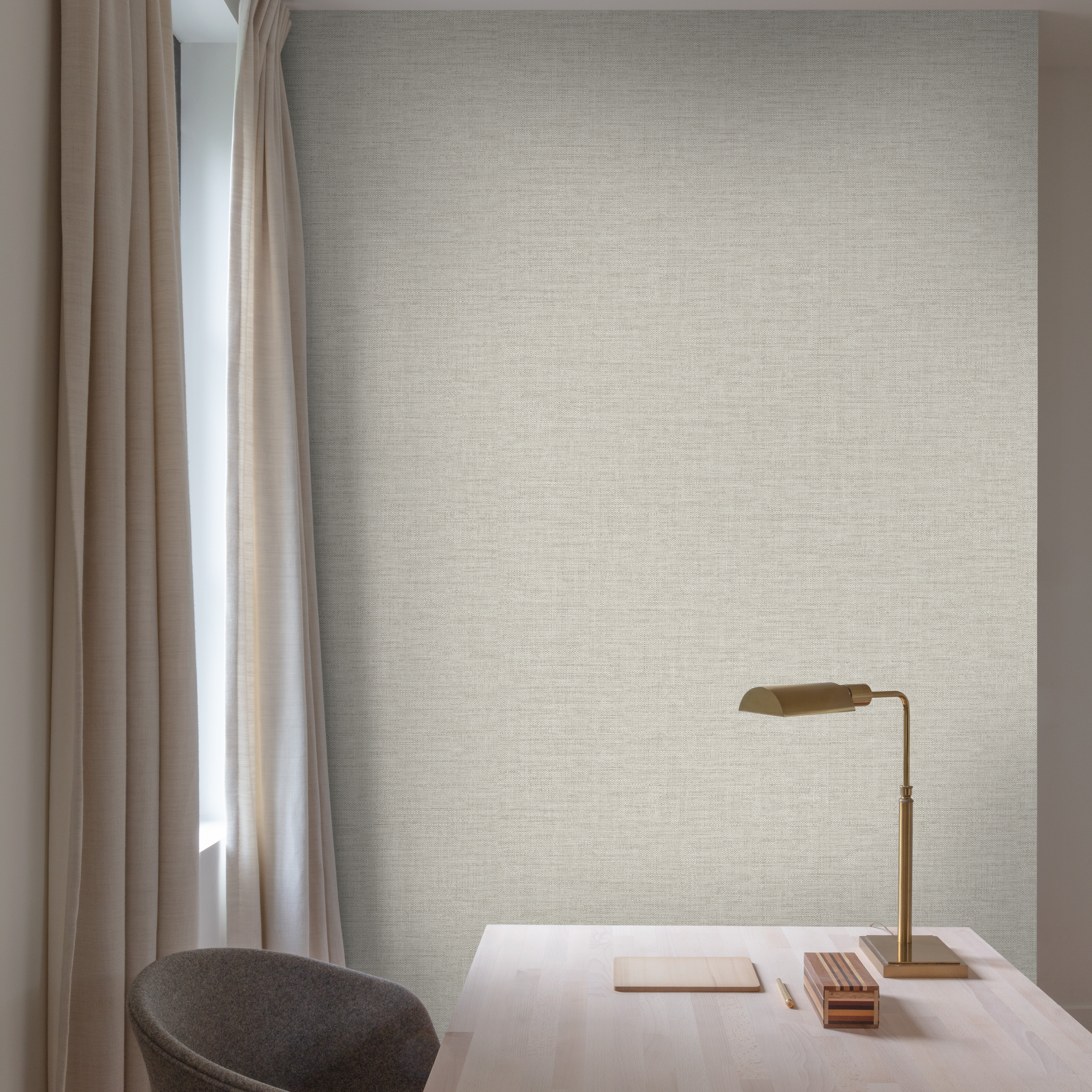 В основе коллекции — мотивы с эффектом текстильной поверхности. Они напоминают мягко натянутую ткань, где свет скользит по волокнам, создавая живую, тёплую игру оттенков. Такие обои наполняют интерьер спокойствием, делают его визуально мягче и уютнее, идеально подходя как для жилых пространств, так и для камерных рабочих зон. Палитра варьируется от природных нейтральных тонов до глубоких, благородных оттенков, позволяя легко подобрать гармоничное решение под любой интерьер.