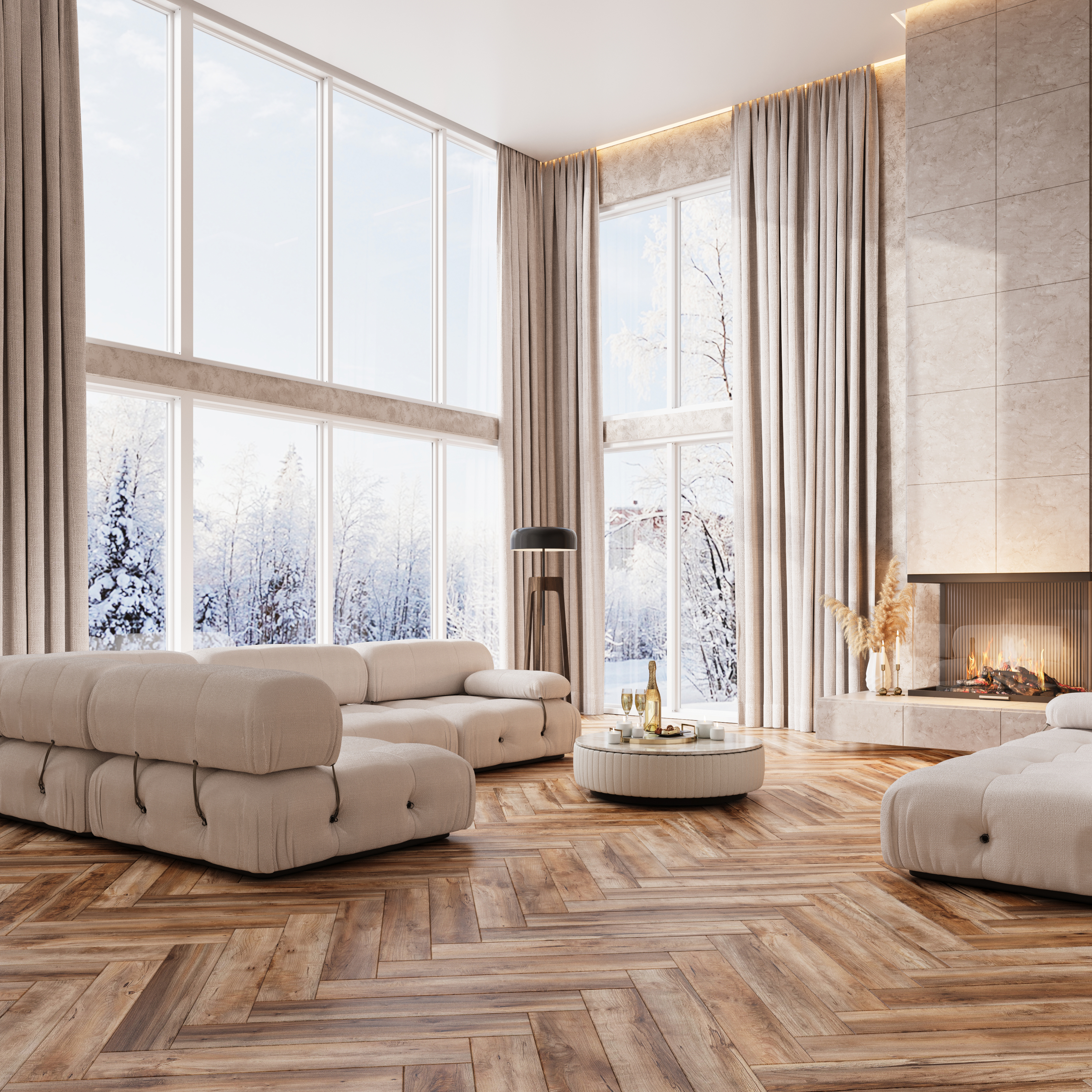 Пол с геометрическим рисунком «ёлка» в разных вариантах укладки может давать ощущение простора или делать атмосферу более камерной.