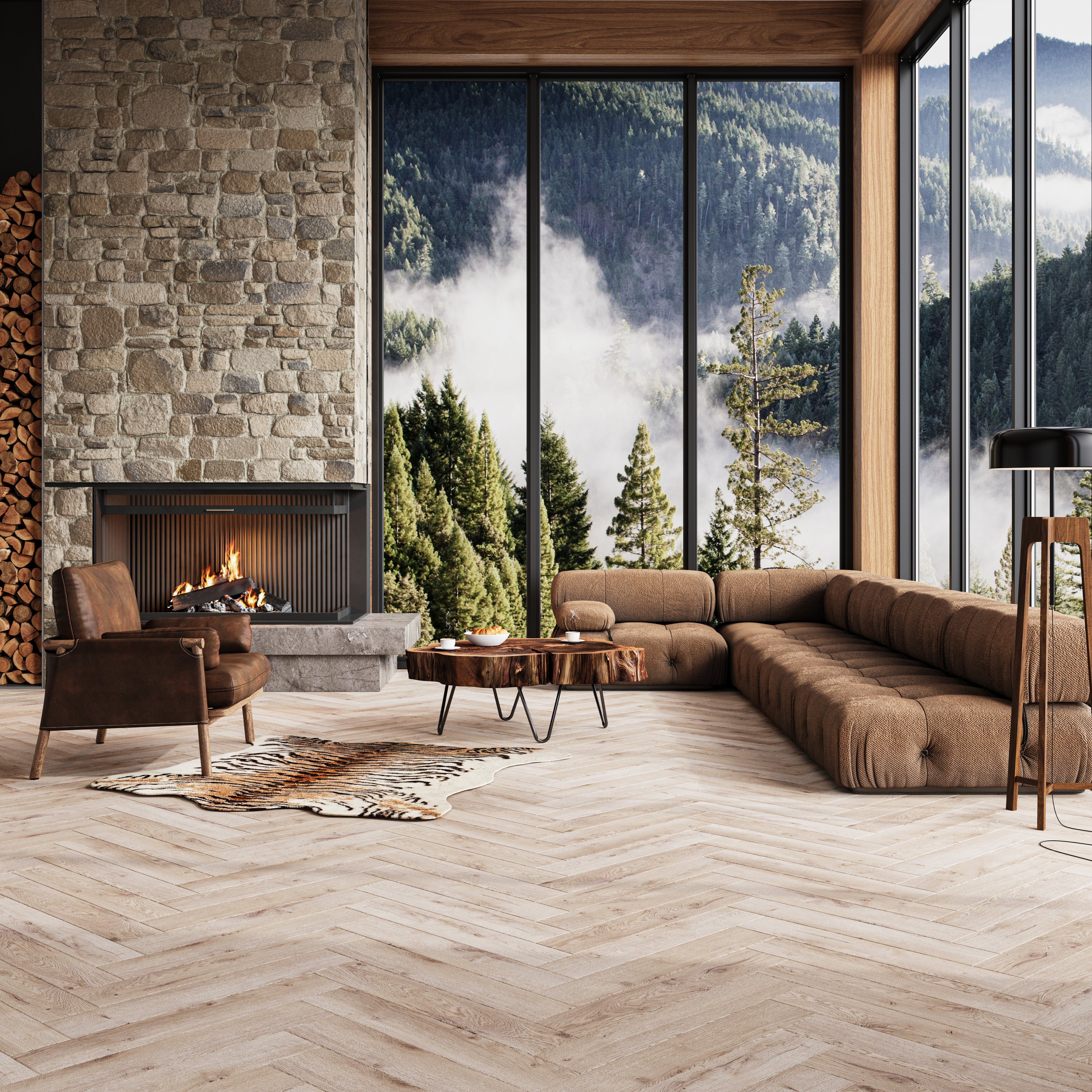 Пол с геометрическим рисунком «ёлка» в разных вариантах укладки может давать ощущение простора или делать атмосферу более камерной.