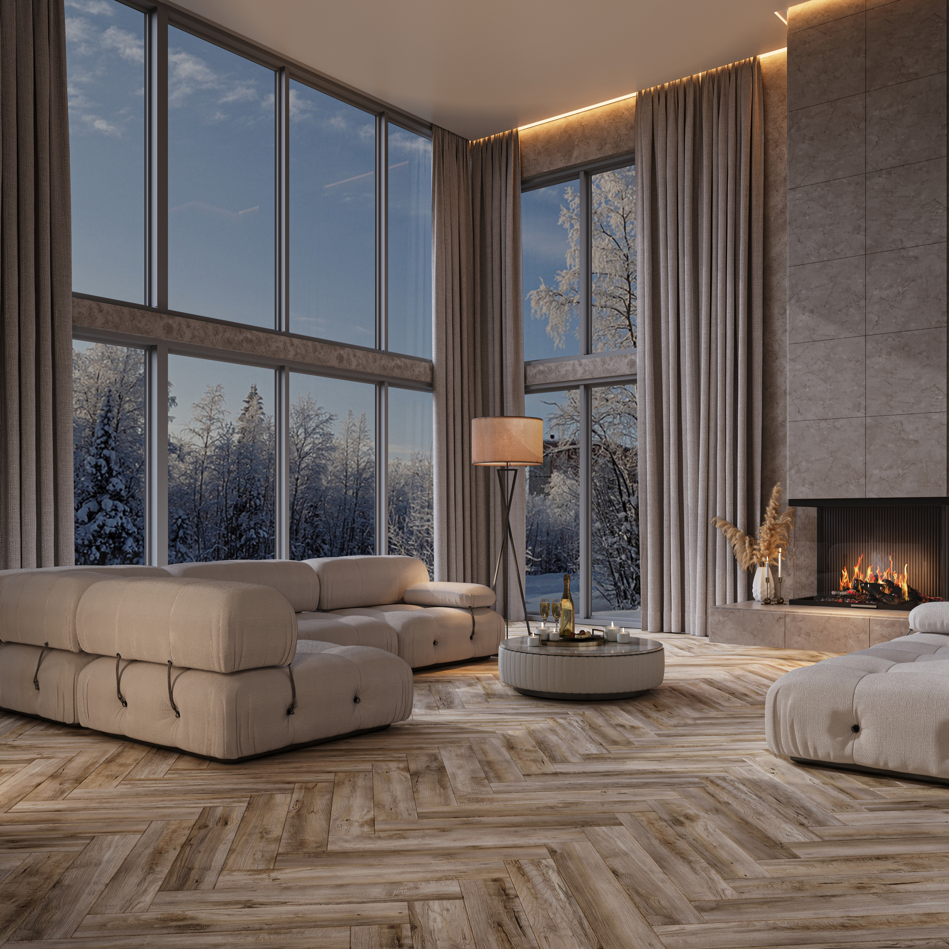 Пол с геометрическим рисунком «ёлка» в разных вариантах укладки может давать ощущение простора или делать атмосферу более камерной.