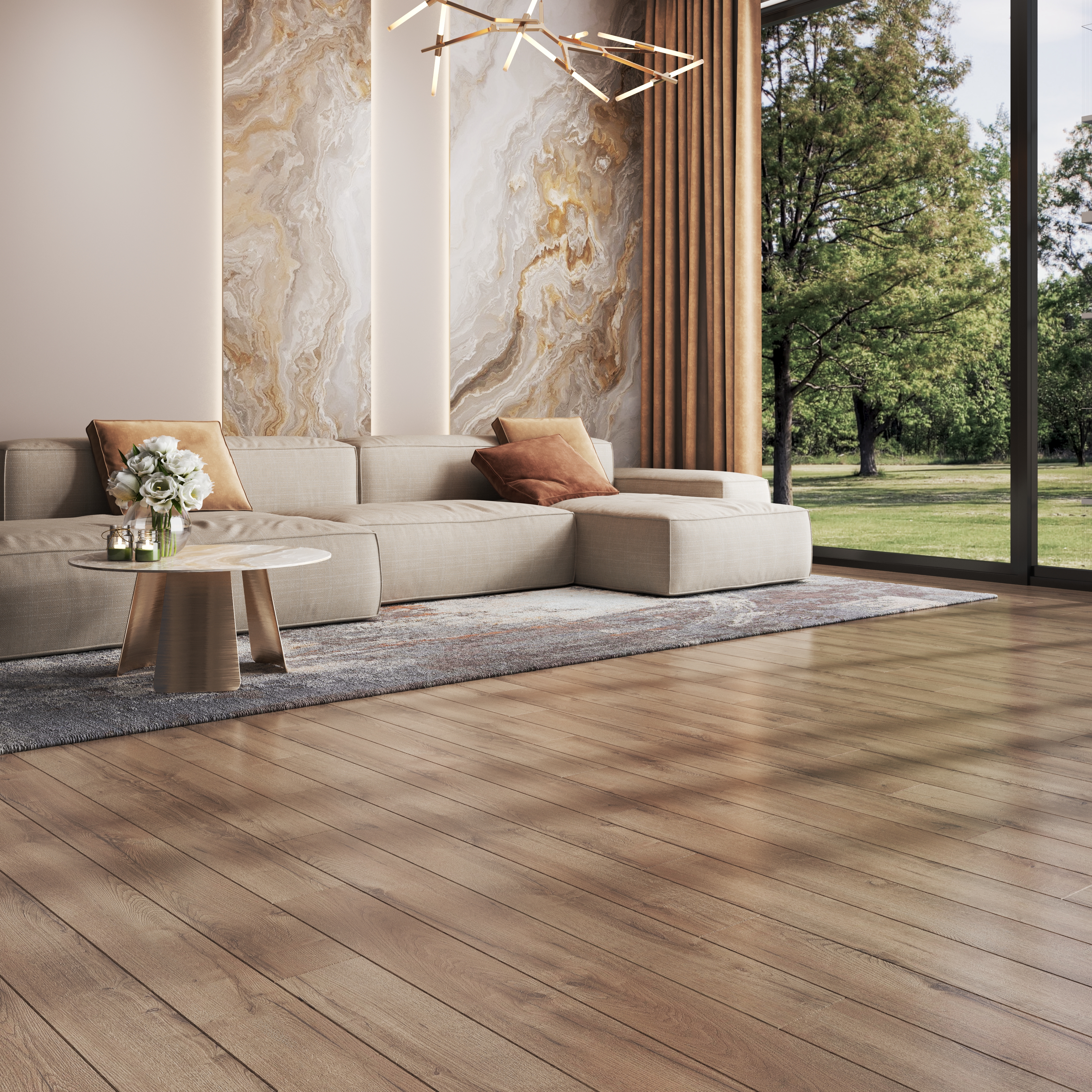 Поверхность пола отражает свет, а мягкий блеск дает ощущение легкости и изящности.