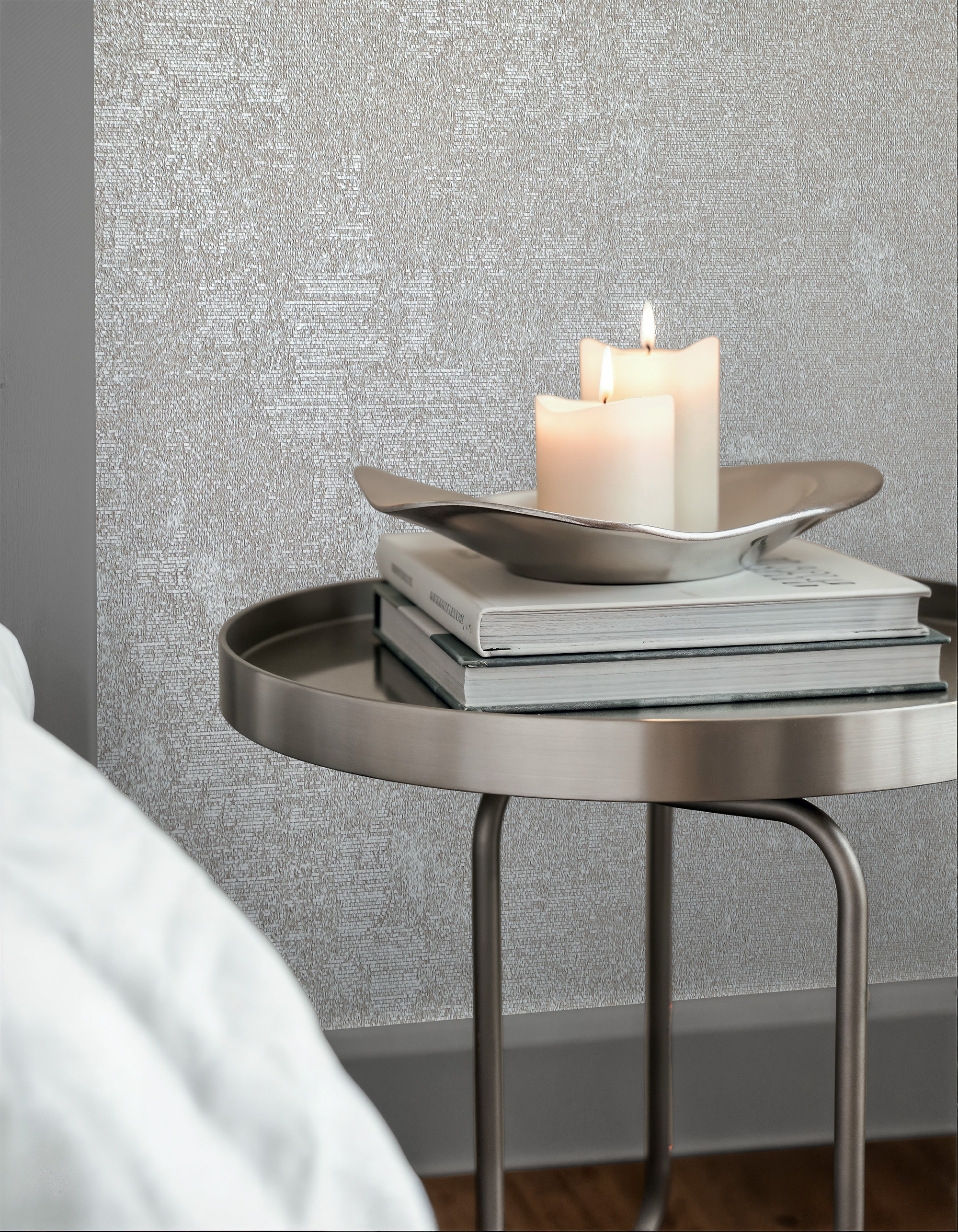 В основе коллекции — многослойные текстуры, игра света и тонкая работа с материалом. Так, мотив штукатурки с сияющими вкраплениями словно оживляет стены: поверхность мягко мерцает, будто отражая дыхание пространства. Это не просто декоративное покрытие — это атмосфера, в которой свет становится частью интерьера, а стены приобретают глубину и движение.